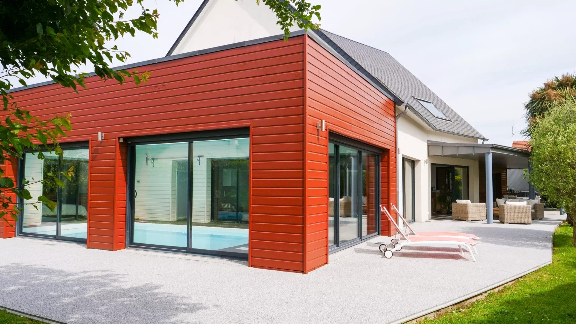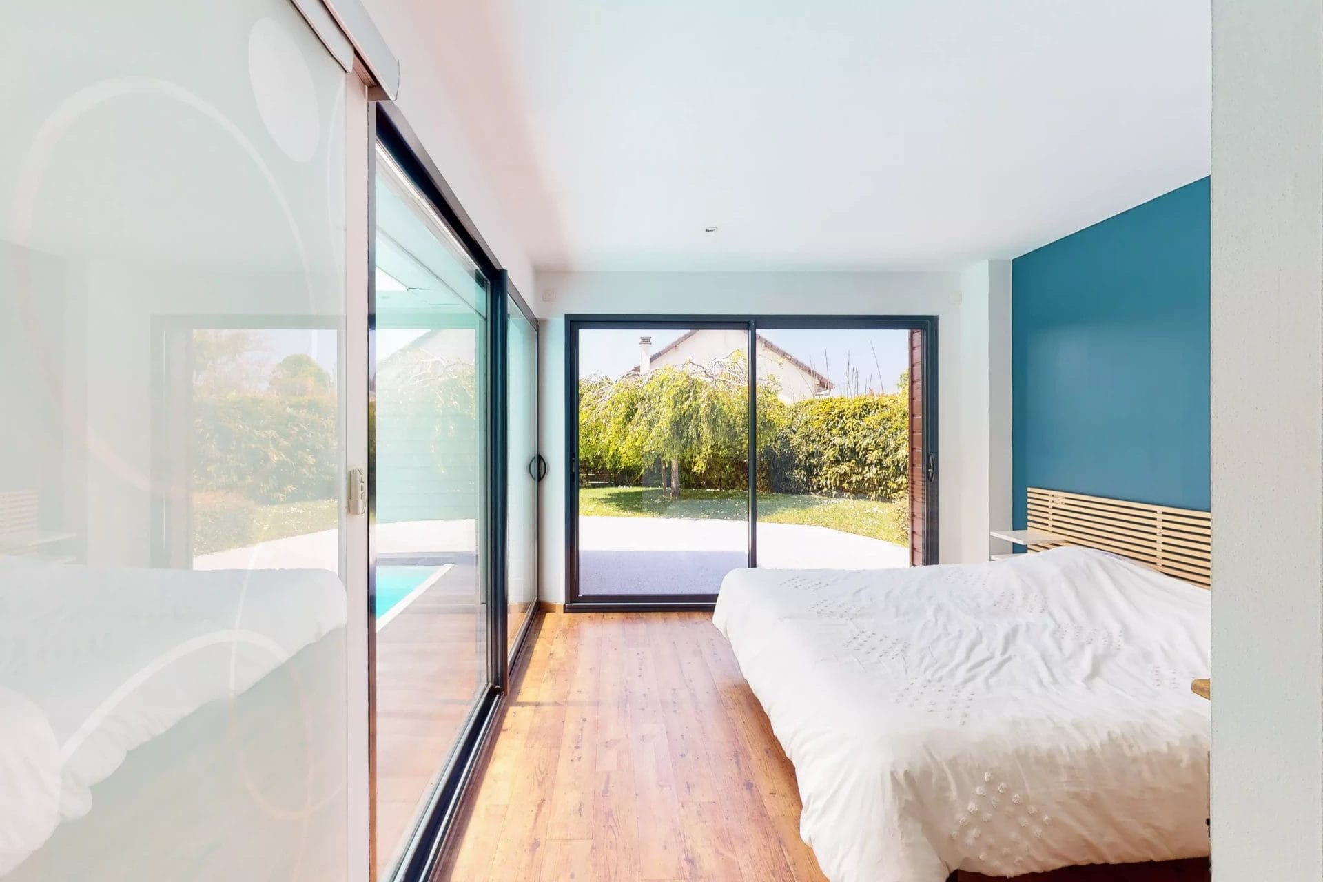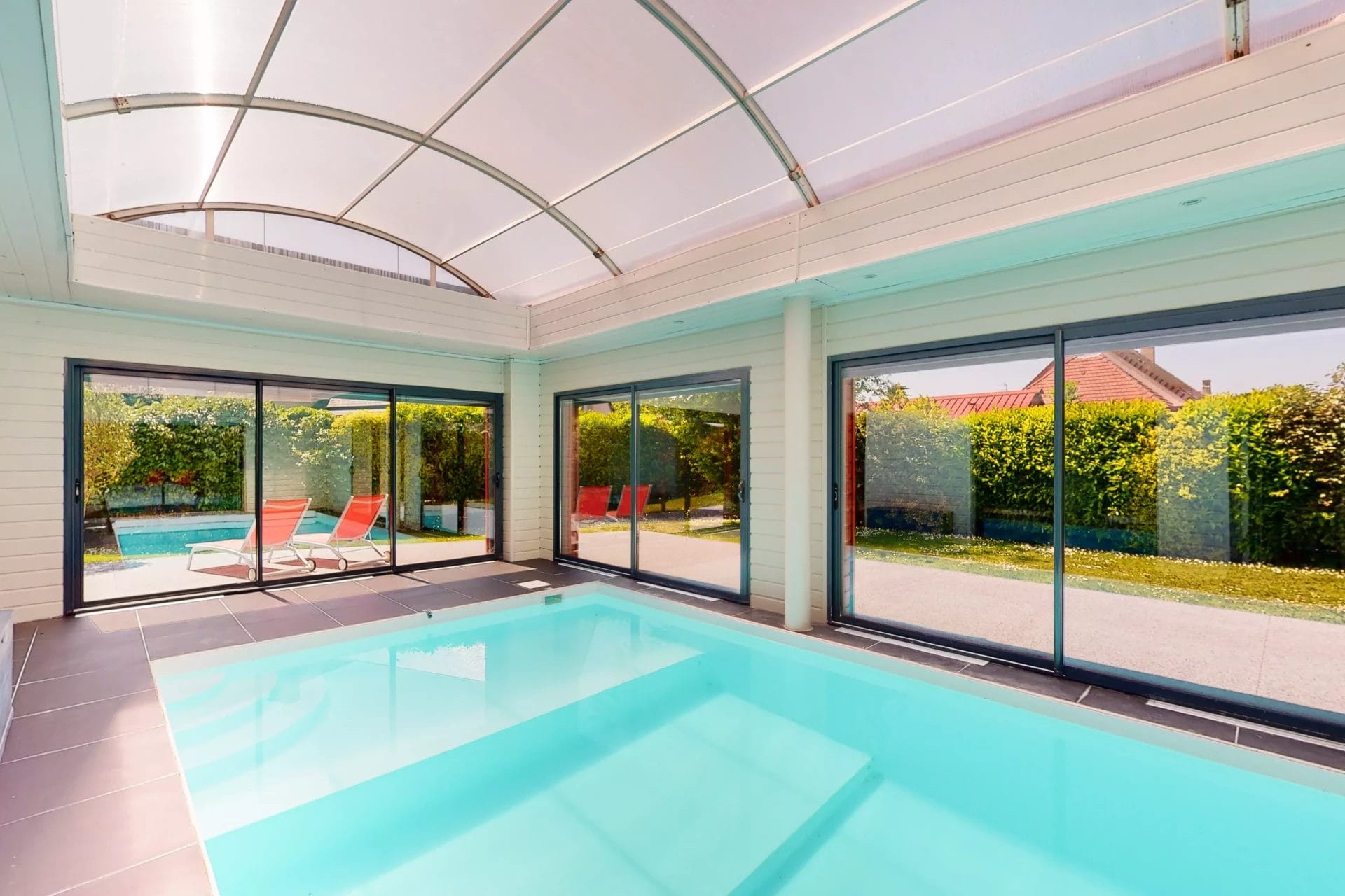 RDC : Entrée, grande pièce à vivre avec cuisine ouverte (58m²), buanderie, 2 WC, 3 chambres (19m² / 15m² / 15m²) dont une suite parentale avec dressing, 3 salles d’eau, 1 salle de bain, piscine couverte (48m²)
